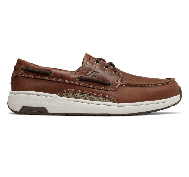 This is a slip-on shoe with a traditional boat shoe three-eyelet lacing system. The short laces help keep the shoe snug, and the New Balance “ROLLBAR” insert for more foot stability. A leather upper looks nice and lends to its durability as a proper boat shoe.